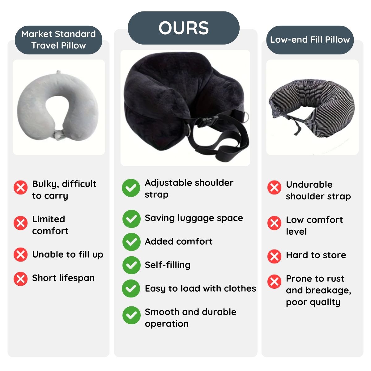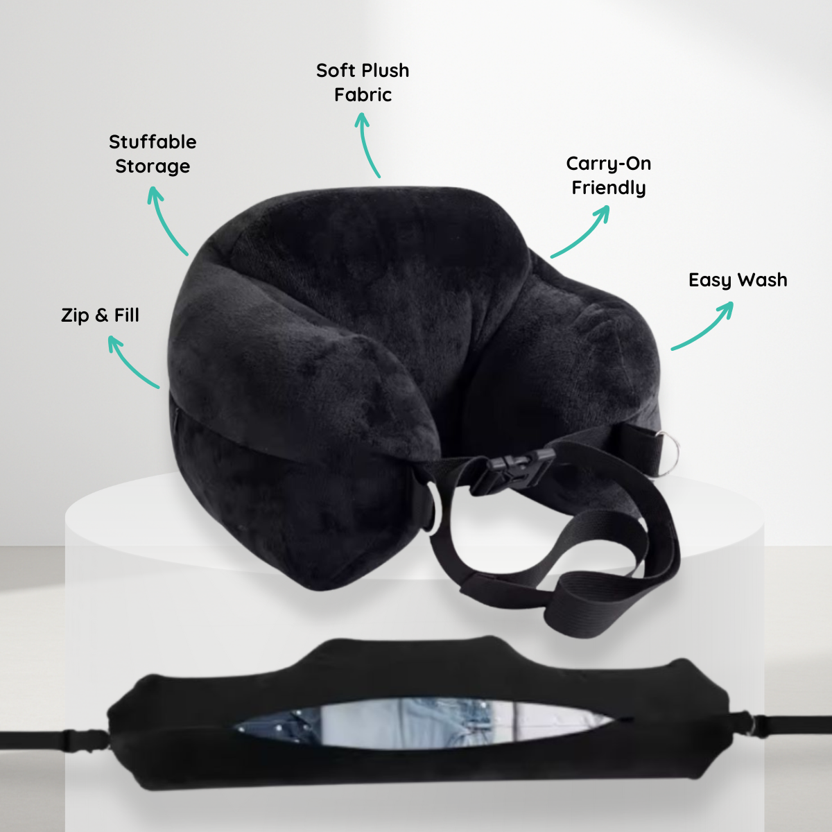 Stuff up to 3 days of clothes into your neck pillow for ultimate space-saving! Roll, stuff, zip, and adjust the strap — simple steps to keep your bag light and your neck supported on every trip.