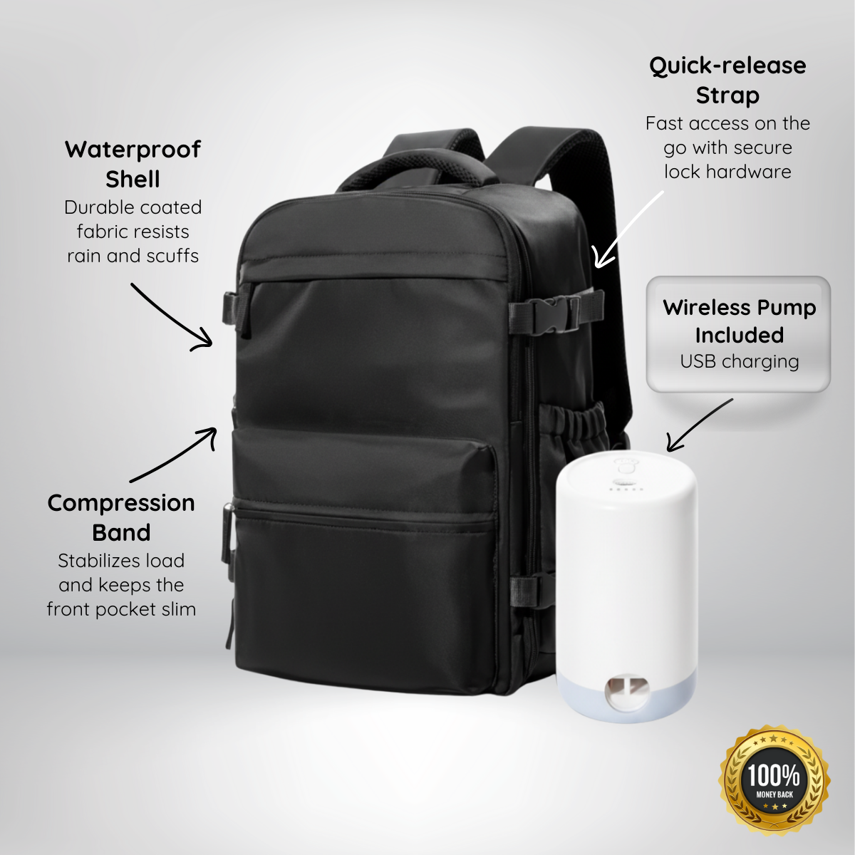 Most bags waste space and get you stung with surprise baggage fees when they don’t fit the gate check. This vacuum compression backpack shrinks your clothes down, unlocks up to twice the usable space and keeps everything tight, slim and carry‑on ready. Travel with more outfits, fewer bags and zero check‑in stress—just grab your pack and go.