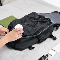 The backpack uses compression bags and a small electric pump to remove excess air from your clothes, shrinking bulky items and freeing up space.